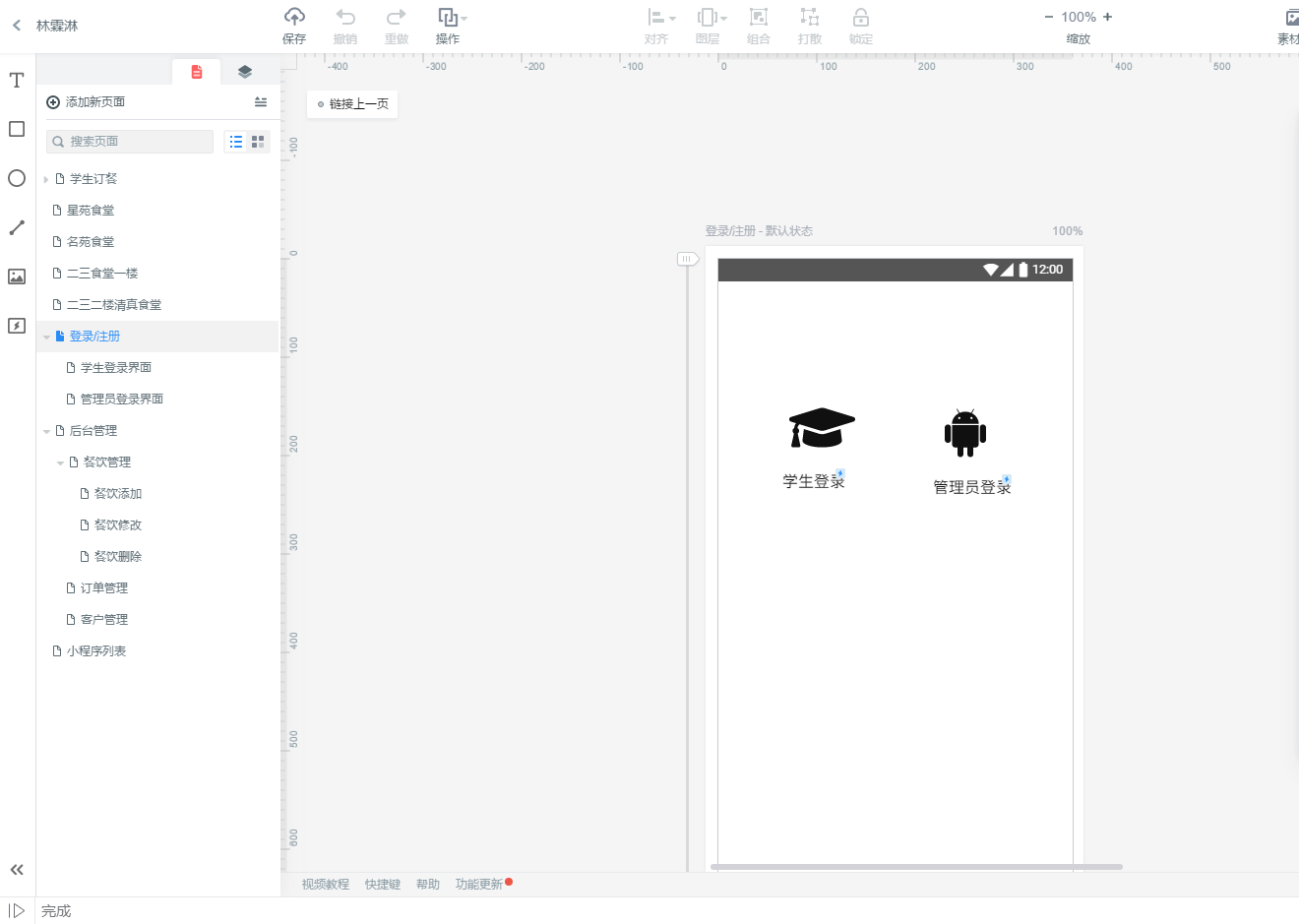 今天主要进行了墨刀原型的设计,力求做出大概的模型,主要分为学生板块和后台管理板块,学生订餐和后台进行信息管理。学生可以选择学校的三个食堂进行点餐,而管理员可以管理餐饮、订单以及用户的信息。还有和队友总结了需求,写出了需求分析报告。
