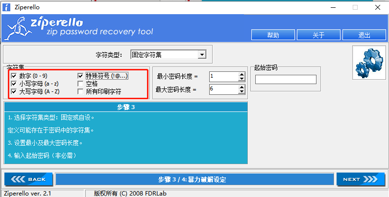 ZIP密码破解工具Ziperello下载后将其解压缩,无需安装,点击程序即可使用!选择恢复方法,以及指定参数以降低密码复杂性的分步式操作界面。与所有的密码恢复工具相同,如果你至少记得密码的一部分或者近似的密码长度将非常有用,因为这会急剧加速密码的恢复速度。