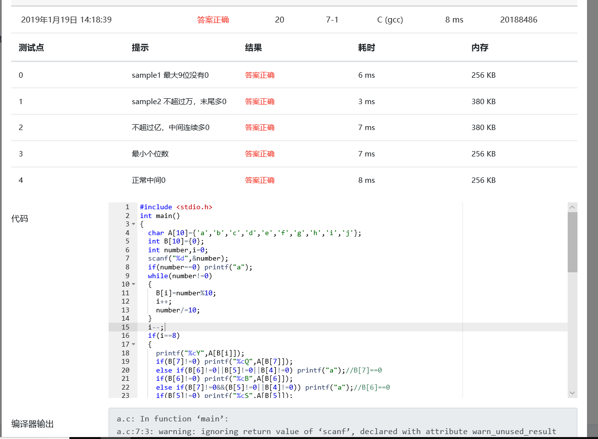 输入一个整数(位数不超过9位)代表一个人民币值(单位为元),请转换成财务要求的大写中文格式。如23108元,转换后变成“贰万叁仟壹百零捌”元。为了简化输出,用小写英文字母a-j顺序代表大写数字0-9,用S、B、Q、W、Y分别代表拾、百、仟、万、亿。于是23108元应被转换输出为“cWdQbBai”元。