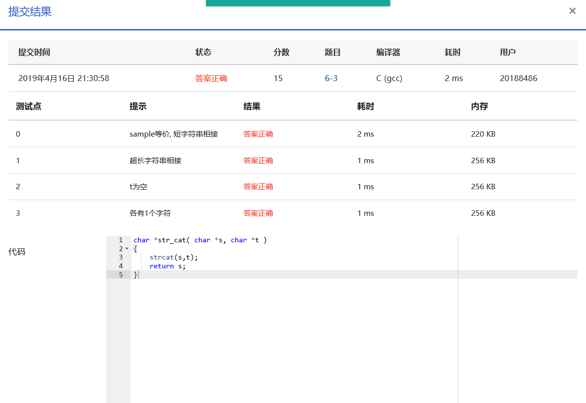 函数str_cat应将字符串t复制到字符串s的末端,并且返回字符串s的首地址。
