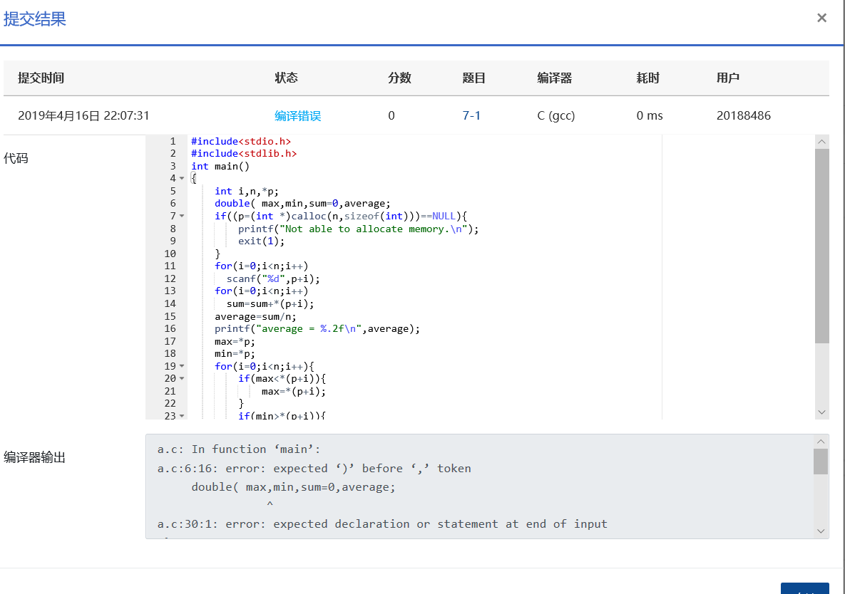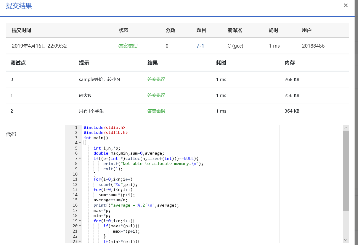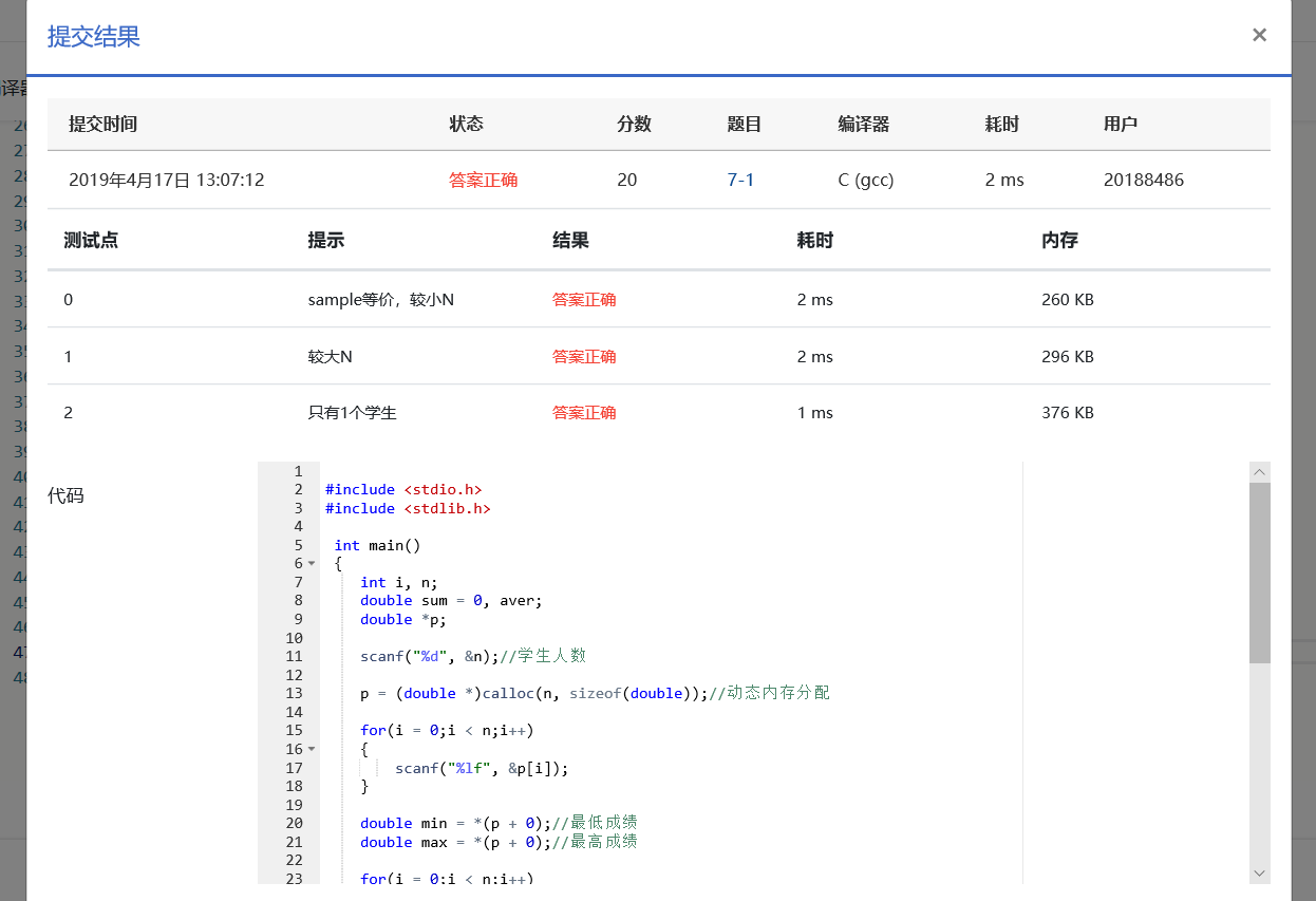 本题要求编写程序,根据输入学生的成绩,统计并输出学生的平均成绩、最高成绩和最低成绩。建议使用动态内存分配来实现。
