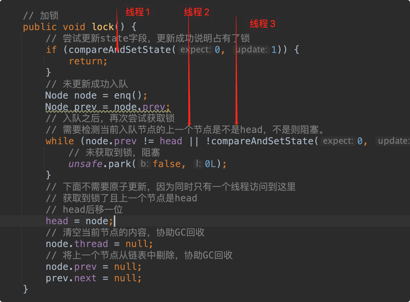 线程1原子更新state成功然后去执行下面的逻辑。线程2和线程3没有抢到锁,都阻塞在unsafe.park(false, 0L)处。并且此时队列是这样的:Node(empty)—Node(线程2)—Node(线程3)