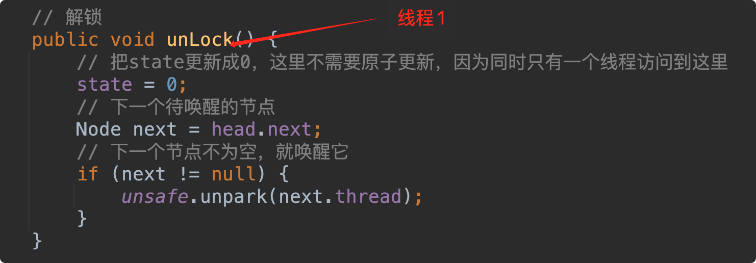 线程1执行业务代码结束并执行unLock方法,执行unLock方法后,在unsafe.park(false, 0L)处阻塞的线程