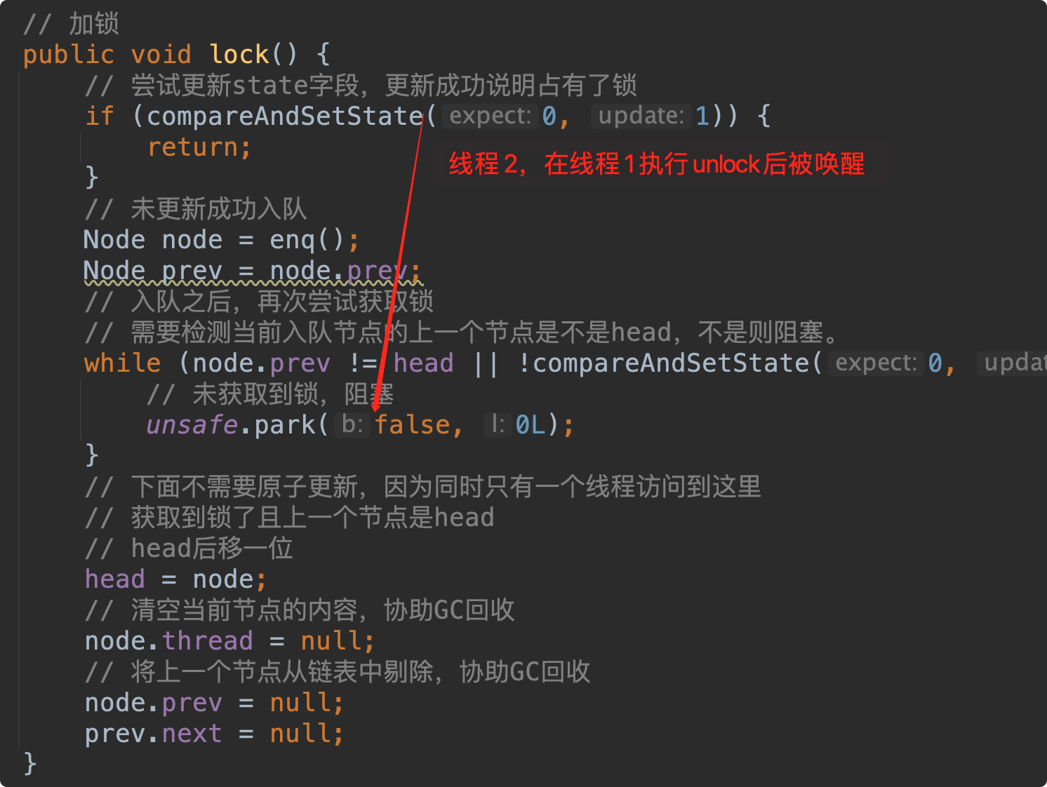 线程2在线程1执行unLock方法的unsafe.unpark(next.thread)被唤醒,再执行一次while (node.prev != head || !compareAndSetState(0, 1)),发现比对符合条件,执行下面的代码。并且队列现在变成Node(线程2)—Node(线程3)