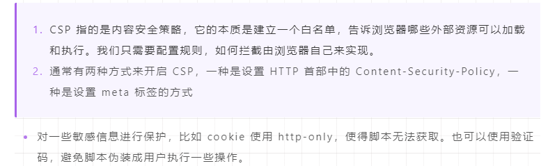 - 使用 CSP ,CSP 的本质是建立一个白名单,告诉浏览器哪些外部资源可以加载和执行,从而防止恶意代码的注入攻击。
