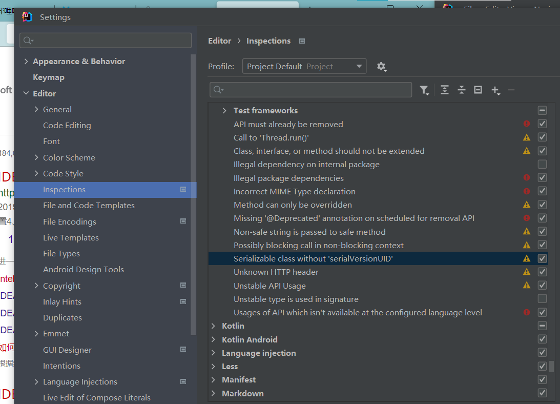 //File-->Settings--->Inspections--->Serializable class without 'serialVersionUID'--->勾选--->OK