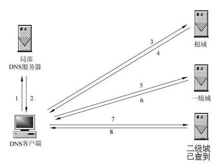 (4)、根DNS服务器没有记录具体的域名和IP地址的对应关系,而是告诉本地DNS服务器,你可以到域服务器上去继续查询,并给出域服务器的地址,这个过程是迭代的过程。