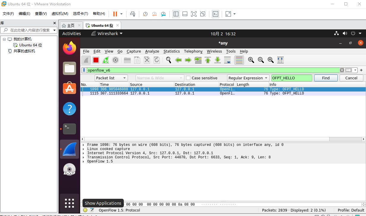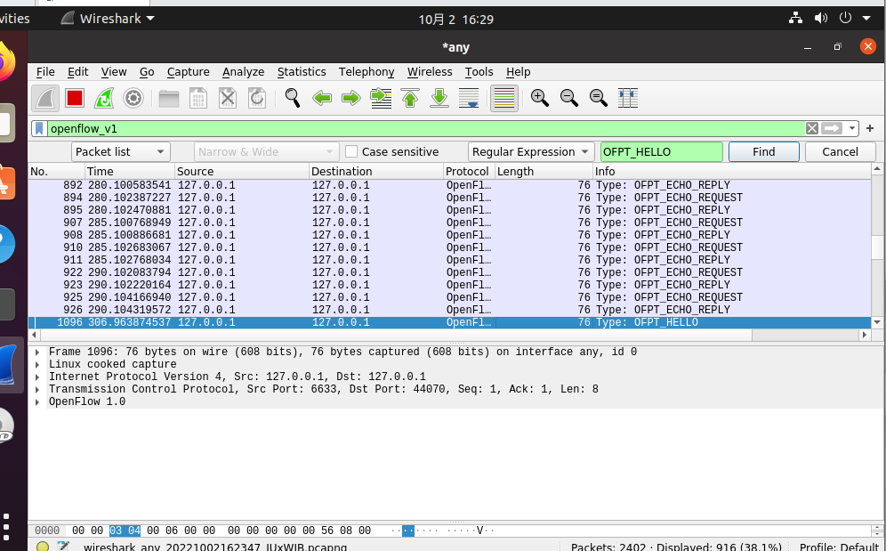 - 能够运用 wireshark 对 OpenFlow 协议数据交互过程进行抓包;