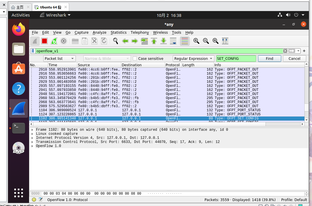 3、回答问题:交换机与控制器建立通信时是使用TCP协议还是UDP协议?