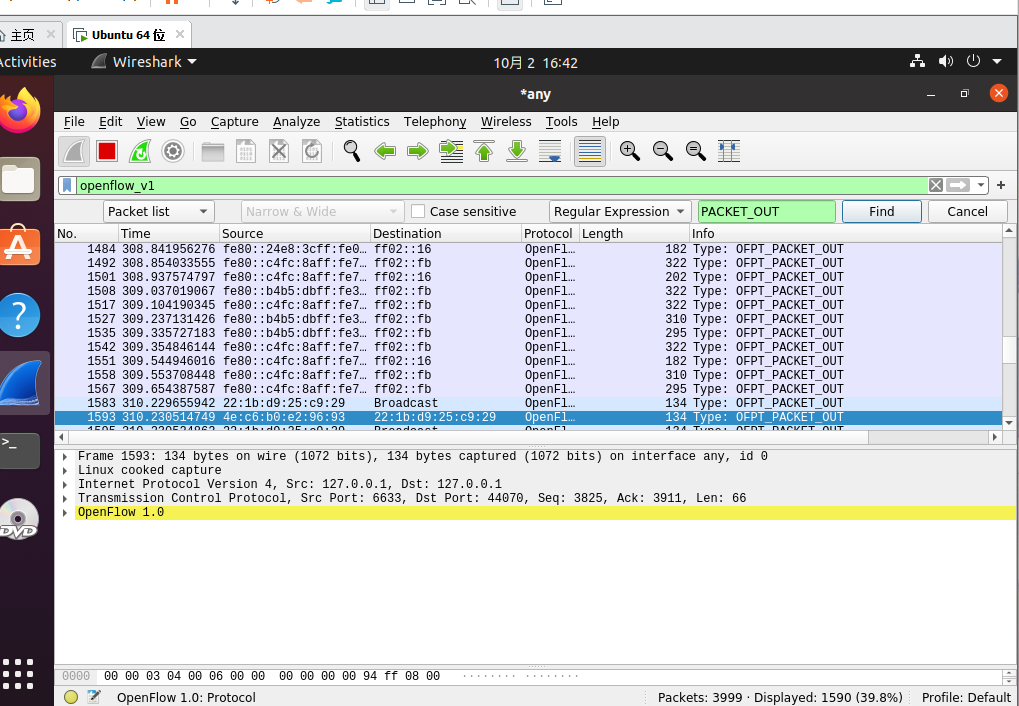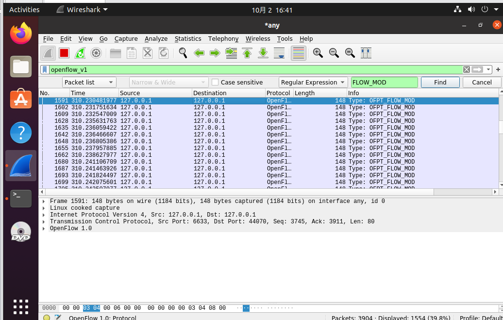 分析抓取的flow_mod数据包,控制器通过6633端口向交换机44070端口下发流表项,指导数据的转发处理