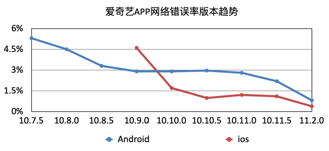 爱奇艺APP的网络错误率,随着版本的持续优化,Android端错误率从最初5.3%,目前稳定在0.48%; IOS端错误率从最初4.63%,目前稳定在0.35%。