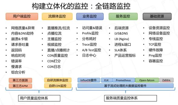 「用户端」主要覆盖客户端和中间链路。目前主要基于美图自研的APM(内部代号哈勃)来做客户端的的质量监测,监控的指标有:网络质量、崩溃、卡顿、响应时间、错误率、慢请求等。除此之外,美图还建设有流媒体的监控体系,主要用来覆盖直播推流拉流、点播拉流、CDN质量等。