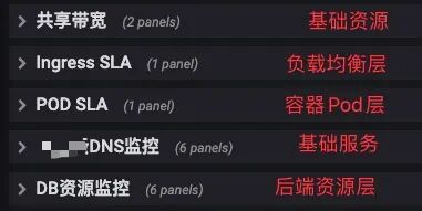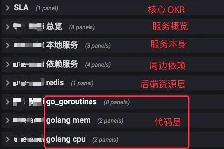 通常的思路就是我们在一张 Dashboard 中,以业务的维度建立不同层次的 Panel,把这个业务相关的各个环节的监控图放到一起,这样业务方在一个页面里去做点击和滚动就可以了,相比前面的方式我们又往前迈了一步。