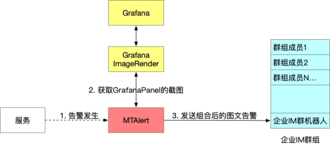 结合美图已有的监控告警组件,我们选择的告警发送请求链路为 Grafana-Image <-> MTAlert -> 企业微信机器人。