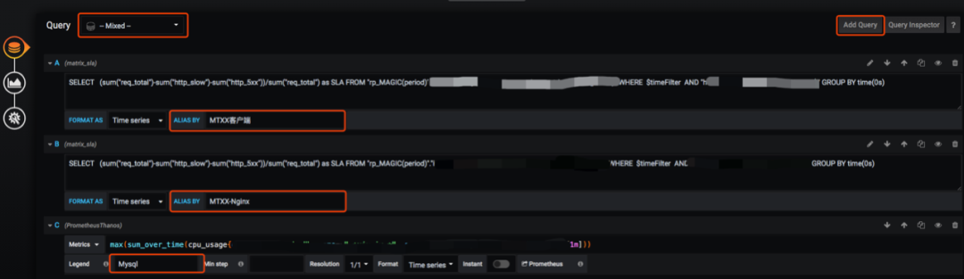 我们需要为关键图形元素添加监控数据源。根据需求可以在报表中添加相应的 Query 语句。