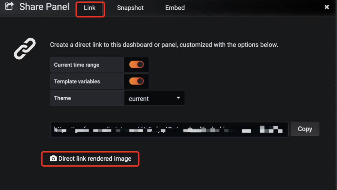 获取指定 Panel 的渲染图形链接。点击指定 Panel 的 Share 后, 可以看到 Direct link rendered image。