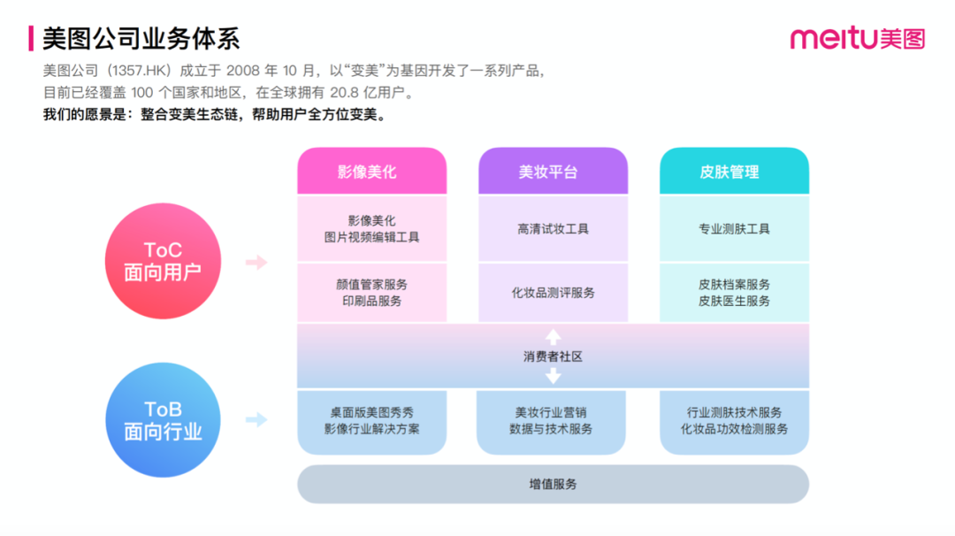 在展开技术实战部分的讲解之前,我们先简单了解下美图公司的业务场景和规模。美图公司的业务主要分为 ToC 和 ToB 两类,以「消费者社区」为核心,在「影像美化」、「美妆平台」、「皮肤管理」几个垂直领域均有面向终端用户和面向企业的产品或解决方案。