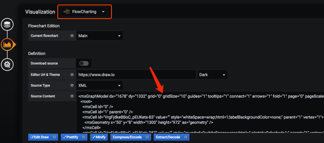 我们先将 draw.io 中的流程图代码粘贴在 Source Centent 中,粘贴完毕后,我们就可以从 Grafana 看板中看到绘制好的图形了。