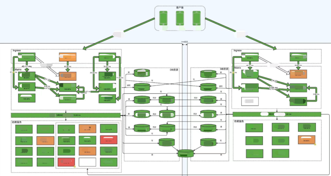 这个方案里各个监控数据之间的逻辑关联性可能不像trace系统中那么紧密,需要人工去梳理服务的监控项、绘制可以体现数据链路及逻辑关系的图标,但是它切实解决了之前我们监控数据逻辑性不够直观的问题。当系统出现问题的时候,我们可以快速的从这张图表中看到各层、各组件及组件之间的链路状态,它切实提高了我们在问题排查中的效率。