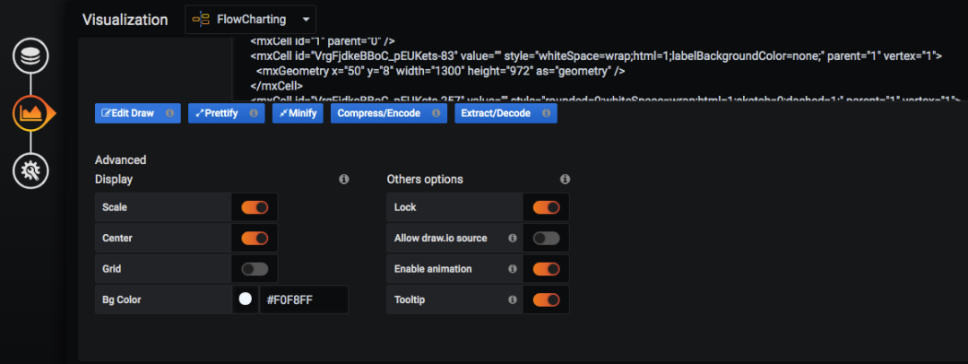 前提条件:Grafana需要安装并开启FlowCharting插件。详见:https://grafana.com/grafana/plugins/agenty-flowcharting-panel/installation