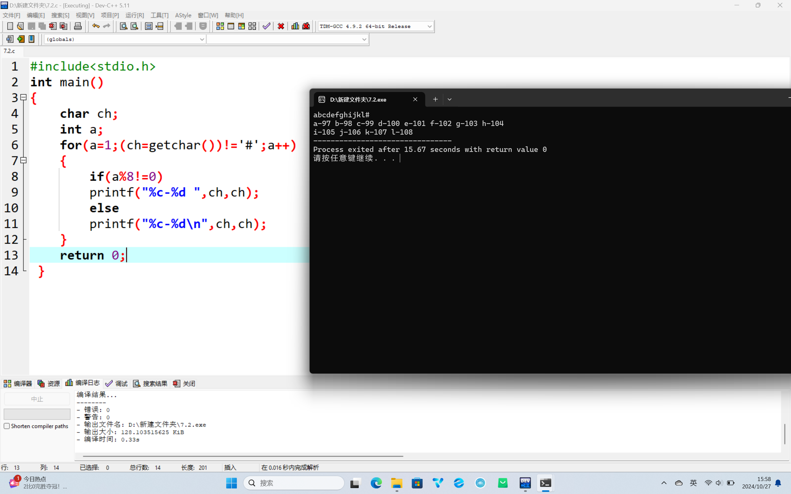 解决:将第二个printf中"\n"改成"%c-%d\n"