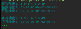 1 x = [5, 11, 9, 7, 42] 2 3 print('整数输出1:', end = '') 4 i = 0 5 while i < len(x): 6 print(x[i], end = ' ') 7 i += 1 8 9 print('\n整数输出2:', end = '') 10 i = 0 11 while i < len(x): 12 print(f'{x[i]:02d}', end = '-') 13 i += 1 14 15 print('\n整数输出3:', end = '') 16 i = 0 17 while i < len(x) - 1: 18 print(f'{x[i]:02d}', end = '-') 19 i += 1 20 print(f'{x[-1]:02d}') 21 22 print('\n字符输出1:', end = '') 23 y1 = [] 24 i = 0 25 while i < len(x): 26 y1.append(str(x[i])) 27 i += 1 28 print('-'.join(y1)) 29 30 print('字符输出2:', end = '') 31 y2 = [] 32 i = 0 33 while i < len(x): 34 y2.append( str(x[i]).zfill(2) ) 35 i += 1 36 print('-'.join(y2))