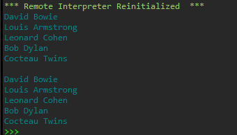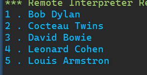 1 name_list=['david bowie','louis armstron','leonard cohen','bob dylan','cocteau twins'] 2 name_list.sort() 3 i=0 4 while i<len(name_list): 5 print(i+1,'.',name_list[i].title()) 6 i+=1 7 print()
