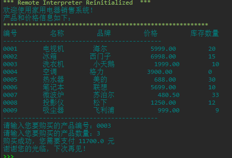 1 """ 2 家用电器销售系统 3 v1.1 4 """ 5 6 # 欢迎信息 7 print('欢迎使用家用电器销售系统!') 8 9 # 产品信息列表 10 print('产品和价格信息如下:') 11 print('*********************************************************') 12 print('{:<10s}'.format('编号'),'{:<10s}'.format('名称'),'{:<10s}'.format('品牌'),'{:<10s}'.format('价格'),'{:<10s}'.format('库存数量')) 13 print('-'*60) 14 print('{:<10s}'.format('0001'),'{:<10s}' .format('电视机'),'{:<10}'.format('海尔'), '{:<10.2f}'.format(5999.00), '{:<10d}'.format(20)) 15 print('{:<10s}'.format('0002'),'{:<10s}' .format('冰箱'),'{:<10}'.format('西门子'), '{:<10.2f}'.format(6998.00), '{:<10d}'.format(15)) 16 print('{:<10s}'.format('0003'),'{:<10s}' .format('洗衣机'),'{:<10}'.format('小天鹅'), '{:<10.2f}'.format(1999.00), '{:<10d}'.format(10)) 17 print('{:<10s}'.format('0004'),'{:<10s}' .format('空调'),'{:<10}'.format('格力'), '{:<10.2f}'.format(3900.00), '{:<10d}'.format(0)) 18 print('{:<10s}'.format('0005'),'{:<10s}' .format('热水器'),'{:<10}'.format('美的'), '{:<10.2f}'.format(688.00), '{:<10d}'.format(30)) 19 print('{:<10s}'.format('0006'),'{:<10s}' .format('笔记本'),'{:<10}'.format('联想'), '{:<10.2f}'.format(5699.00), '{:<10d}'.format(10)) 20 print('{:<10s}'.format('0007'),'{:<10s}' .format('微波炉'),'{:<10}'.format('苏泊尔'), '{:<10.2f}'.format(480.50), '{:<10d}'.format(33)) 21 print('{:<10s}'.format('0008'),'{:<10s}' .format('投影仪'),'{:<10}'.format('松下'), '{:<10.2f}'.format(1250.00), '{:<10d}'.format(12)) 22 print('{:<10s}'.format('0009'),'{:<10s}' .format('吸尘器'),'{:<10}'.format('飞利浦'), '{:<10.2f}'.format(999.00), '{:<10d}'.format(9)) 23 print('-'*60) 24 25 # 商品数据 26 products=[ 27 ['0001','电视机', '海尔',5999.00,20], 28 ['0002','冰箱', '西门子',6998.00,15], 29 ['0003','洗衣机', '小天鹅',1999.00,10], 30 ['0004','空调', '格力',3900.00,0], 31 ['0005','热水器', '格力',688.00,30], 32 ['0006','笔记本', '联想',5699.00,10], 33 ['0007','微波炉', '苏泊尔',480.00,33], 34 ['0008','投影仪', '松下',1250.00,12], 35 ['0009','吸尘器', '飞利浦',999.00,9], 36 ] 37 38 # 用户输入信息 39 product_id = input('请输入您要购买的产品编号:') 40 count = int(input('请输入您要购买的产品数量:')) 41 42 #获取编号对应商品的信息 43 product_index=len(product_id)-1 44 product=products[product_index] 45 46 # 计算金额 47 print('购买成功,您需要支付',product[3]*count,'元') 48 49 # 退出系统 50 print('谢谢您的光临,下次再见!')