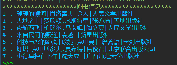 1 book_list = [['静静的顿河','肖洛霍夫','金人', '人民文学出版社'], 2 ['大地之上','罗欣顿.米斯特里','张亦琦', '天地出版社'], 3 ['夜航西飞', '柏瑞尔.马卡姆', '陶立夏', '人民文学出版社'], 4 ['来自民间的叛逆', '袁越', '','新星出版社'], 5 ['科技与恶的距离', '珍妮.克里曼', ' 詹蕎語', '墨刻出版社'], 6 ['灯塔','克里斯多夫.夏布特','吕俊君','北京联合出版公司'], 7 ['小行星掉在下午','沈大成', '', '广西师范大学出版社']] 8 x = '图书信息' 9 print(x.center(45,'*')) 10 i=0 11 while i<len(book_list): 12 print(i+1,'.','|'.join(book_list[i])) 13 i+=1