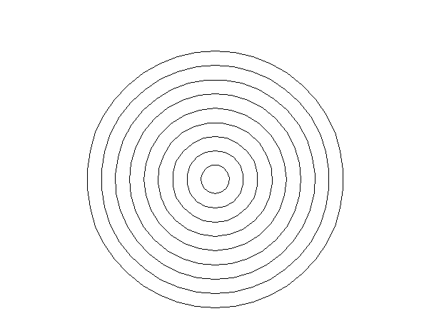 1 from turtle import* 2 3 def moveto(x,y): 4 penup() 5 goto(x,y) 6 pendown() 7 8 def main(): 9 setup(800,600) 10 11 radius=20 12 offset=20 13 14 for i in range(9): 15 moveto(0,-radius) 16 circle(radius) 17 radius+=offset 18 19 hideturtle() 20 done() 21 22 main()