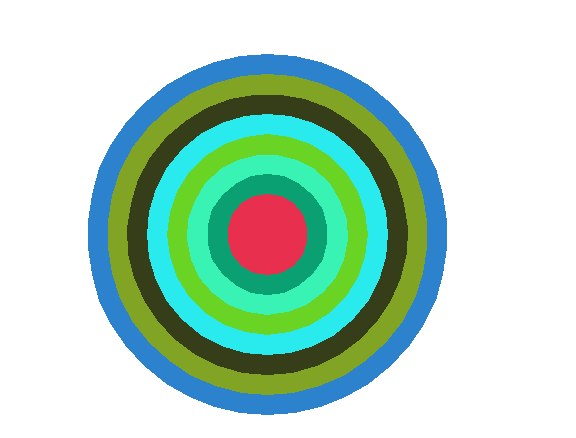 1 from turtle import* 2 from random import random 3 4 def moveto(x,y): 5 penup() 6 goto(x,y) 7 pendown() 8 9 def gen_color(): 10 return tuple((random() for i in range(3))) 11 12 def main(): 13 setup(800,600) 14 15 radius=180 16 offset=20 17 18 for i in range(8): 19 moveto(0,-radius) 20 color(gen_color()) 21 22 begin_fill() 23 circle(radius) 24 end_fill() 25 26 radius -=offset 27 28 hideturtle() 29 done() 30 31 main()