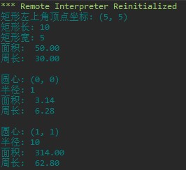 1 from shape import Rect,circle 2 3 shape_lst=[Rect(5,10,5),circle(),circle(1,1,10)] 4 5 for i in shape_lst: 6 i.info() 7 print(f'面积:{i.area():.2f}') 8 print(f'周长:{i.perimeter():.2f}') 9 print()