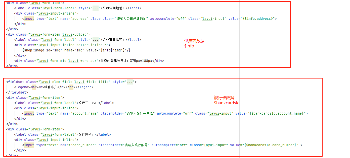 //如果在添加供应商信息时,没有给银行卡字段添加 这个时候就需要做出判断 不能让给银行卡添加一条空数据的 if (!empty($data['bank_name']) && !empty($data['card_number']) && !empty($data['account_bank']) && !empty($data['account_name'])) { //添加绑定銀行卡数据 并获取当前银行卡添加数据的主键id $storeId = $this->getLastInsID(UserBankcardsModel::insert($newData)); //getLastInsID获取最近插入的ID //添加供应商并组装供应商数据 $data = [ 'store_name' => $data['store_name'], 'category' => $data['category'], 'mobile' => $data['mobile'], 'status' => $data['status'], 'audit' => $data['audit'], 'firm_name' => $data['firm_name'], 'firm_address' => $data['firm_address'], 'img' => $data['img'], 'name' => $data['name'], 'password' => $data['password'], 'url' => $data['status'], 'bankcards_id' => $storeId, ]; $storeAdd = Store::insert($data); if (!$validate->check($data)) { $result['status'] = false; $result['msg'] = $validate->getError(); } } else { //只添加供应商的数据 $storeAdd = $this->allowField(true)->save($data); } return $result; }