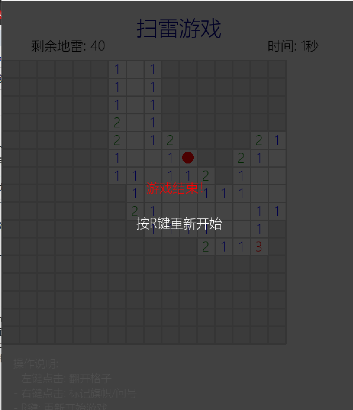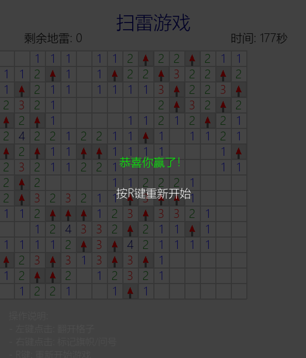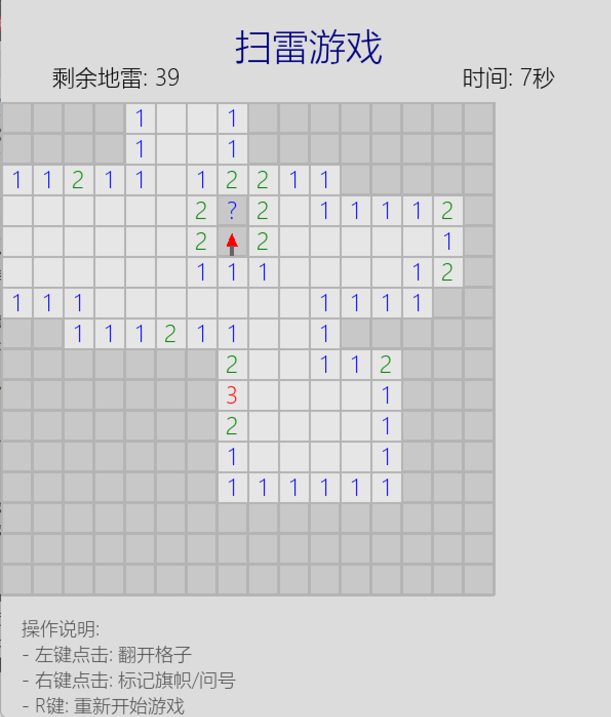mines_text = font.render(f"剩余地雷: {self.mines_count - len(self.flags)}", True, (0, 0, 0))