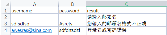 把测试的数据分离到csv文件中username,password,result ,,请输入邮箱名 sdfsdfsg,Asrety,您输入的邮箱名格式不正确 awesras@sina.com,sdfdrtsdzf,登录名或密码错误