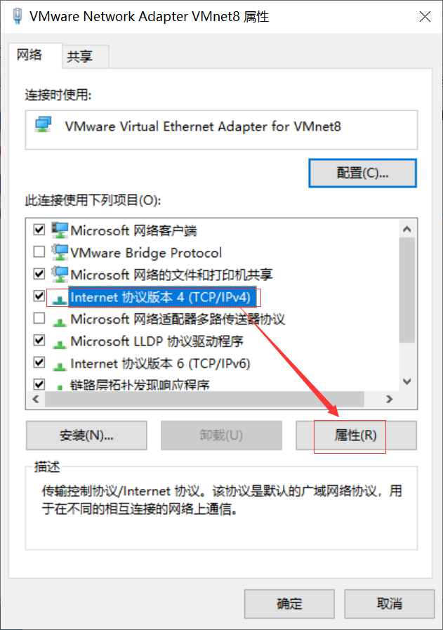 若物理机与虚拟机通过NAT模式连接,则需修改VMnet8的IP: