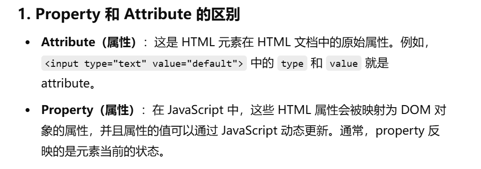 - 动态性:这些属性是动态的,可以在运行时不断更新。例如,你可以通过改变 input 元素的 value 属性来更新文本框中的内容,但是这个改变仅仅反映在页面渲染时的状态上,而不会修改页面的 HTML 源码。