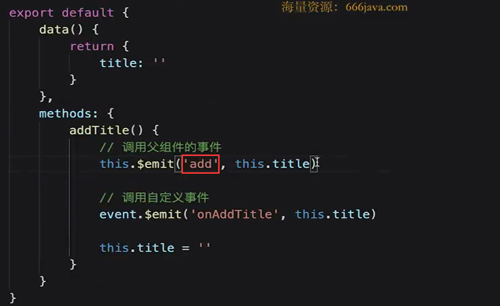 $emit:事件触发,在index.vue中在两个子组件内传入了两个方法:add delete。