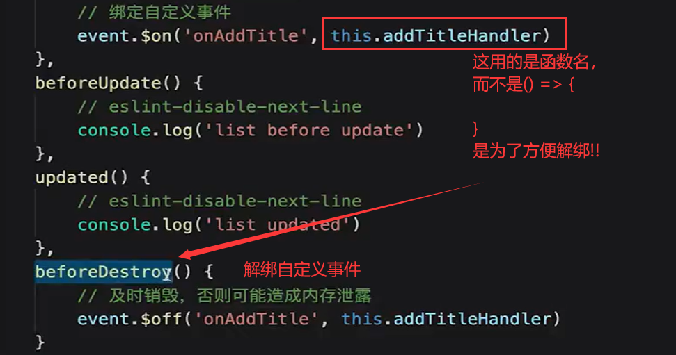 注意一个重要的点:👇 在beforeDestroy中要及时解绑自定义事件,否则可能造成内存泄漏。