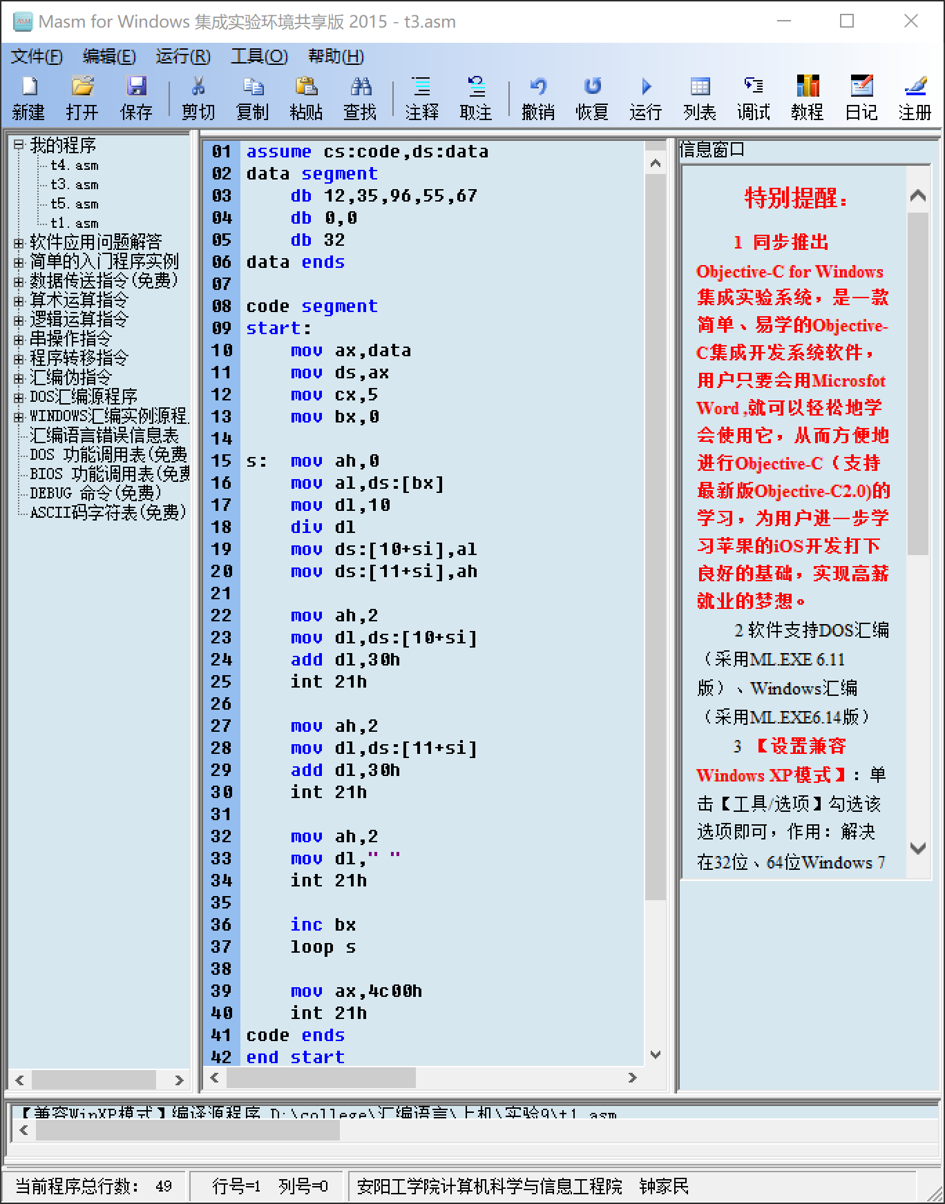 1.本次实验是第一次在ASM环境中完成,在ASM中,代码段、数据段等都在新建的时候就生成格式,比在dosbox中更为方便,在编写代码时也与dosbox有所区别。