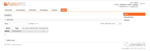 rabbitmq默认会创建guest账号,只能用于localhost登录页面管理员
