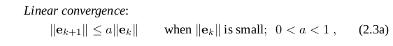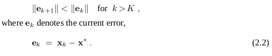 在许多例子中,方法产生的向量收敛于最小值的过程中有两个不同的阶段。当x0是离答案比较远的时候,我们希望方法生成的迭代可以平稳地移动到x*。在迭代的全局阶段,我们是满意的,如果误差不增加除了在最初的步骤中,误差不增加的意思,就是得到的xk越接近x*,例如: