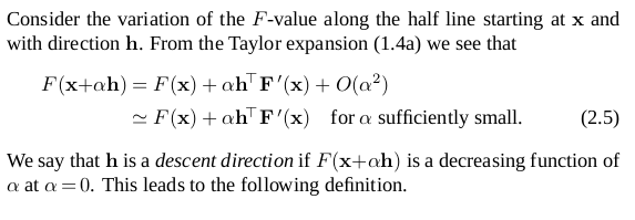 如果F(x+ah)是一个下降函数,在a充分接近于0的时候,那么h就可以称为是一个下降的方向。
