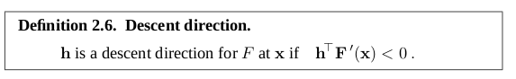 上面求导的式子要大于零,才会说明走的一个步长得出的值是比F(x)要小,那么只有cosθ取负值,得到的正数才是最大的,就是h的方向和F’(x)的方向成pi角度,那么就可以对方向的取值,使用上式子(2.8)
