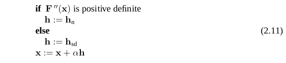 我们可以构建一个混合的方法,基于牛顿方法和最速下降法。根据(2.10)牛顿方法在下降的时候要保证F’’(x)是正定的,因此混合算法的主要部分如下: