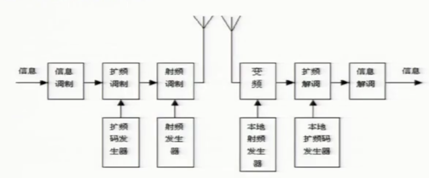 扩频调制是本节课要讲的内容,射频调制是上节课讲的内容,如幅度调制、频移调制、相移调制