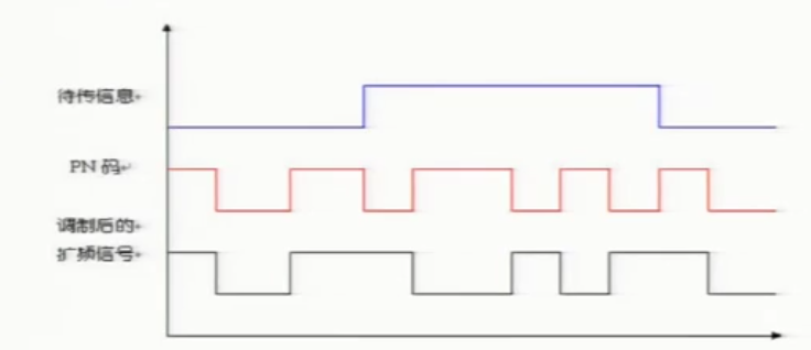 最上面是待传输的信息,中间是伪随机码,二者相异或的结果就是我们所说的扩频,简单理解一下这个过程;