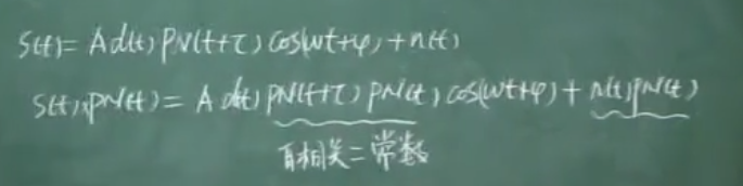 上图下面的式子是解扩,也是乘以PN(t),前面一项PN(t)自己乘以自己是一个自相关的常数,得到的结果是一个功率谱密度高,但是带宽窄的频谱,后面一项就是对噪声进行扩频,得到了功率谱密度低,带宽很宽的频谱,就把噪声和信号分开了。