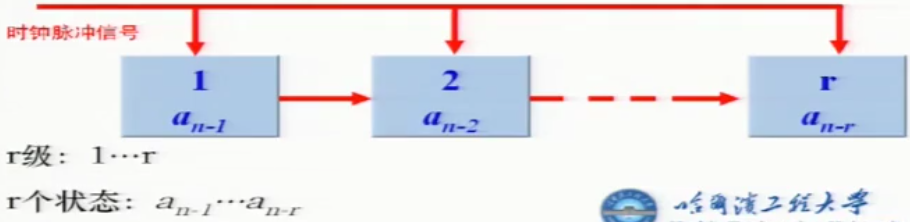 由r个串接的双态存储器(如双稳态触发器)和一个移位时钟信号发生器组成。
