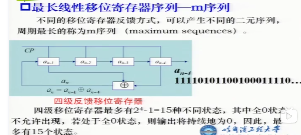 不同的移位寄存器反馈方式,可以产生不同的二元序列,周期最长的称为m序列(maximum sequences)